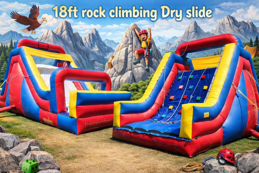 Dry slide 18ft Rock Climbing Dry slide in Easley, Anderson, Greenville and surrounding areas brings full-size thrill to your event. This back-load rock wall dry slide stands 18 feet tall and features a wide slide chute and a realistic climbing wall with rope. Rent this unit to deliver high-energy fun for kids and teens. Fast setup. Safe design. Memorable moments. 🚀
