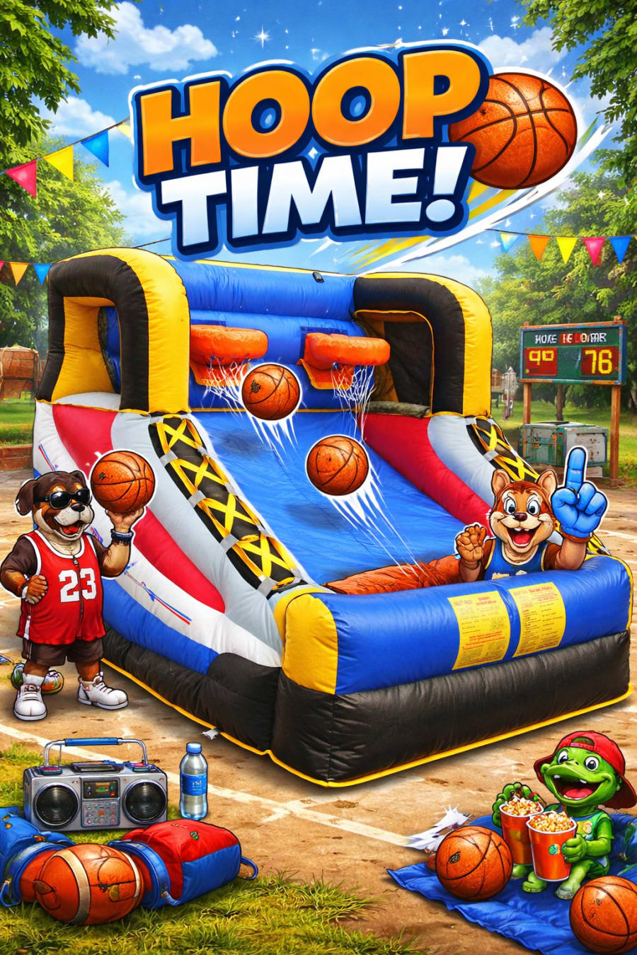 Hoop Time is the must-have game for backyard gatherings, birthday party's, school events, corporate events, and church events 🎉. Fast to set up. Safe for kids and adults. High-energy fun that keeps guests cheering. Perfect as an add-on to bounce house rentals, waterslide rentals, or obstacle course rentals.