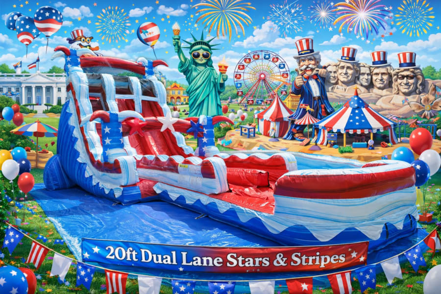 Wet/Dry slide rental 20ft Stars and Stripes dual line makes a big statement. This 20-foot inflatable slide delivers high-energy thrills and visual impact. Perfect for backyard birthday parties, church gatherings, school carnivals, company outings, and charity events. Quick setup. Safe operation. Memorable photos. πΈ