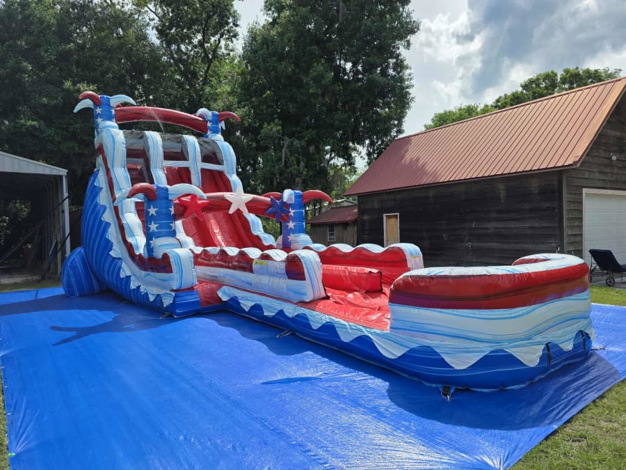 Wet/Dry slide rental 20ft Stars and Stripes dual line makes a big statement. This 20-foot inflatable slide delivers high-energy thrills and visual impact. Perfect for backyard birthday parties, church gatherings, school carnivals, company outings, and charity events. Quick setup. Safe operation. Memorable photos. πΈ